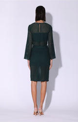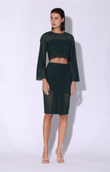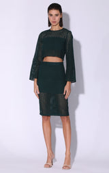 The Faye Skirt is a midi length pencil in a chicl eyelet fabric that is fabulous by itself and even more showstopping when worn with the Fontaine Top