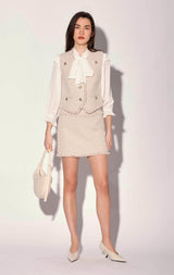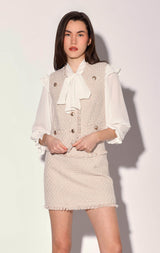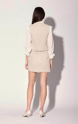 Inspired by classic suiting style, the Dana Vest has a single breasted 3 button closure and fringe accents. Wear as a top or as a chic 3 piece look with the Daphne Skirt and Declan Jacket
