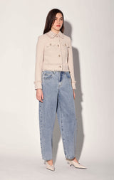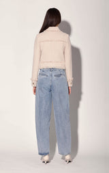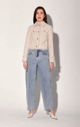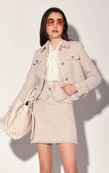The Declan Jacket is a timeless tweed look with fringe accents and flap pocket details. A collar button down style, it pairs great with jeans or the matching Daphne Skirt
