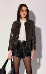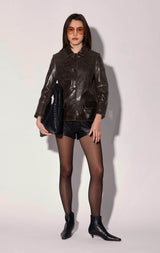 The Hillary Jacket is a collar button down style in our novelty leather. With a tailored fit and faux tortoise button detail, it adds an air of chic sophistication to any look.