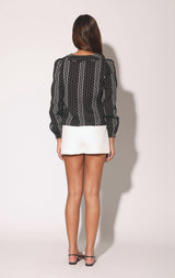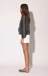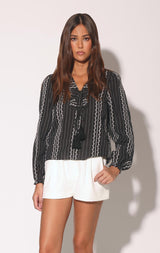The Cadence top is an effortless boho style blouse. In our beautiful embroidered fabric, it also showcases a lace up detail with tassels and mini ruffle acccents.