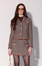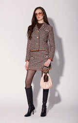 With a notch collar and tailored fit, the Veronica Jacket is sleek and sophisticated. In a textured tweed with self fringe and pearl accented buttons, it’s a chic set with the matching Vallery Skirt
