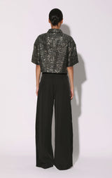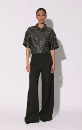 Dress up your button down look with the sequin Max Top! This crop boxy collar shirt with wide short sleeves is as versatile as it is eye catching