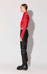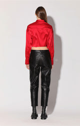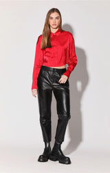 Featuring a crop length, and drop shoulder, the Montana Top is a sassy satin update to the classic button down.
