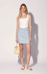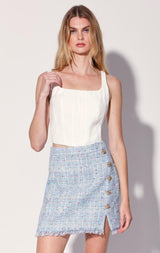 The Allegra Skirt is tweed mini with asymmetric gold engraved button detail and sassy slit. Wear it with the matching Astrid Top for a playful set look