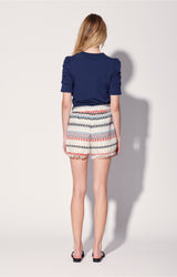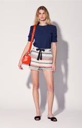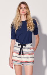 The Jackie Short is a chic tweed short with a playful vibe. Showcasing front tie detail and fringe hem, it goes great with our knit tops or with the Jones Jacket as a set