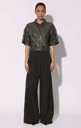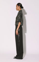 The Romeo Pant is a flattering wide leg pant with elegant satin side panel detail. For a classy cool look, pair with a white tank and the Rebecca Blazer