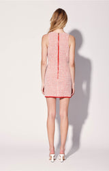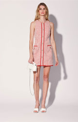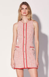 The Alexia Dress is the perfect tank dress upgraded with our playful tweed fabric. This tailored fit mini features engraved buttons and ribbon trim accents
