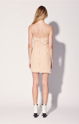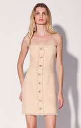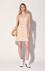 The Bridget Dress is a strapless bustier style mini in our chic tweed fabric! With fringe accents and button details, its even more stylish as a set with the Diane Jacket