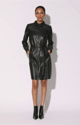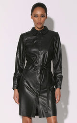 The Clara dress is a slim and sexy take on the shirt dress. This collared button down leather dress with tie waist detail will bring out your Femme Fatale