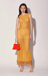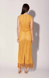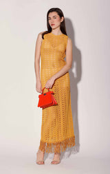 The Paula Dress is a column shape dress with fringe hem accent in our beautiful crochet fabric. Dress it up with heels or go more casual with flats