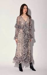 The Alicia Dress is a stylish V neck maxi with a flowing silhouette. Combining all over etheral ruffles and a soft animal print, it's a sassy take on boho style