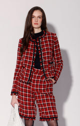A classy silhouette in our fabulous tweed, the Taryn Jacket features contrasting ribbon accents and novelty crystal buttons. Wear with the Ada Skirt for a fun 2 piece look