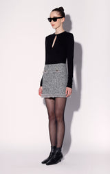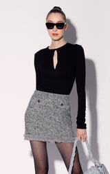 The Reba Skirt is a mini in our luxe tweed fabric that showcases fringe details and faux welt pockets with novelty buttons. Wear it with the Mabel Jacket for a classy set