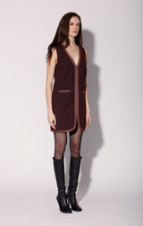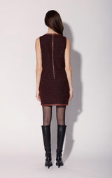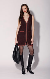 The Evie Dress is a little sassy and a little sweet together in our chic tweed fabric. With a plunge neckline, this curved hem mini is embellished with eye catching ribbon trim and front pockets.