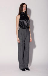 The Blayne top is a sophisticated satin top with an edge. Featuring an asymmetric stand collar and shirring details, it will make any outfit sassy and classy
