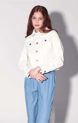 Collar button down front closure; Short easy fit; Long sleeves with buttoned cuffs; Chest pockets with button flaps; Seaming details, banded bottom