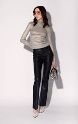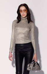 With a touch of shimmer, the Evanna Top is a turtle neck knit top that can jazz up any look
