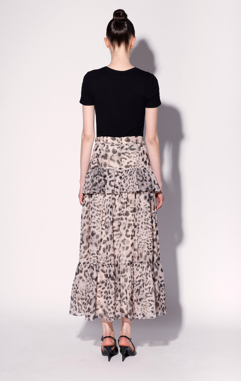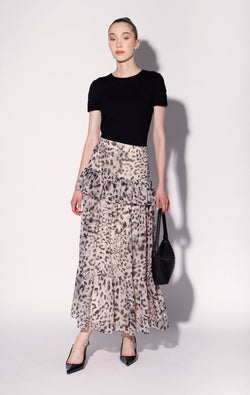 The Amari Skirt is a full maxi skirt in our etheral animal print chiffon. With ruffle details and a shirred flounce, It's an effortlessly femme addition to your closet