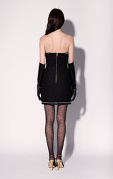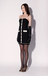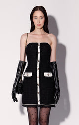 The Britney Dress is a strapless bustier style mini in our chic tweed fabric! With fringe accents, pearl trim and bejeweled button details, its even more stylish as a set with the Dylan Jacket