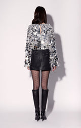 The Denise Top is a crop top here to make a statement! With its long flare sleeves in sequin fabric, featuring large piette and feather details, It adds instant glam to your ensemble