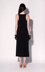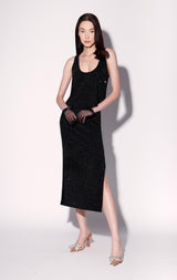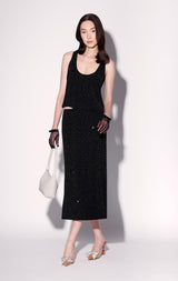 For elegance with a little edge, try the Gianna Skirt. This knit midi is a straight column style with an alluring side slit and a touch of sparkle for the perfect amount of attitude