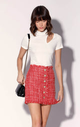 Bold and beautiful, the Rebel Skirt is a tweed mini with self fringe accents and beautiful flower shaped buttons. Wear with our knit tops or the matching Roxy Jacket for a chic set look!