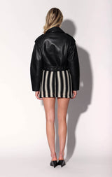 This season's must have moto is the Alexi Jacket. With its short length and wide belted waist, it features exaggerated dropped sleeves and exposed zipper detail