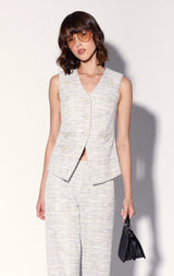 Refresh your vest style with the Starla Vest. This longline style, in our chic tweed quality, features welt pockets and novelty shank buttons