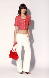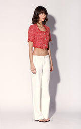 For a cool crop in a chic bright tweed, try our Rita Top. With floral shape buttons and self fringe accents, wear it with your favorite jeans or back to the Rebel Skirt for a playful set