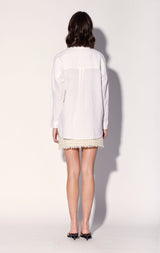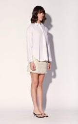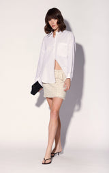 The Samira Top is a classic boyfriend collar button down with a patch pocket and high low shirt tail hem. Wear it with slouchy pants, or make it edgy by wearing it partially unbuttoned over short shorts