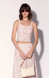 Our stylish tweed gets flirty with the Aria Top! This crop look with gold buttons and fringe accents can be casual with jeans or trendy chic with the matching Aubrey Skirt