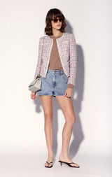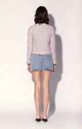 The Farah Jacket is a classic collarless shape in our beautiful tweed with rhinestone ribbon accents and luxe novelty buttons. Cool with jeans, it makes a chic statement worn back to the matching Fayette Skirt