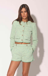 The Harmony Jacket is a short jacket in our playful tweed fabric. Wear it with jeans or as a set with the Henri Shorts