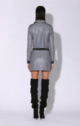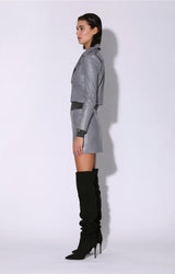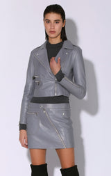 For a sleek fitted crop moto, the Jenny Jacket is the perfect unbelted style with a rebel vibe. For a rock star set, wear with the Gavriel Skirt