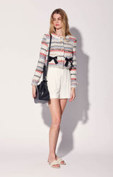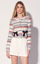The Jones Jacket is a chic tweed style updated with patch pockets and fun bow accents. It's great to dress up jeans or wear back to the Jackie Short as a 2 piece look