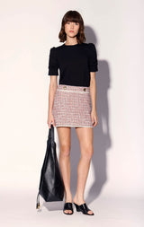The Hera Skirt is a classic fit mini tweed skirt in our colorful tweed fabric with ribbon trim accents and bold button detail. Wear back to one of the matching jackets for a fun 2 piece look