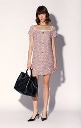 The Hayden Dress is a tweed mini with an effortless shift shape. With a wide square neck and short sleeves and bold buttons, it's perfect to go from desk to dinner.