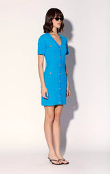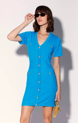 Be date night ready in a flash with the London Dress. This fitted knit mini is elevated with welt pockets details and gold button accents