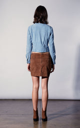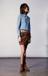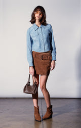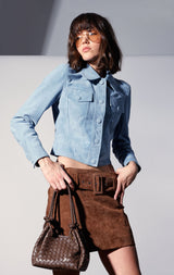 The Kacey Jacket combines classic jean jacket elements in our luscious suede quality. Coming in a beautiful blue color, it will be your new go-to