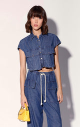 Cropped doesn't get any cooler than the Bryce Top. This edgy look has 2 oversized front cargo pockets and dropped sleeveless shoulders and comes in our soft washed chambray
