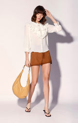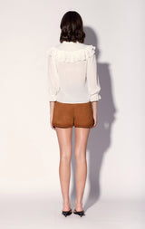 - Blouson sleeves with elastic and ruffle cuffs