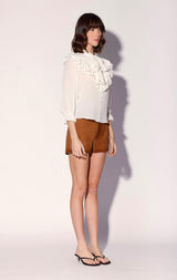 The Davina Top is a gorgeous sheer blouse with playful ruffle detail. Featuring pearly buttons and a long neck tie, it adds class to any look