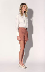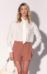 The Monroe Top is stylish button-down update to your crop look with its chic necktie detail, drop shoulder, and long cuffs. It gives a sleek sophistication to any ensemble, from our tweed mini skirts to your favorite jeans.