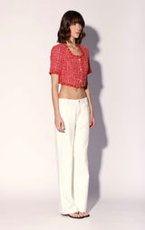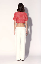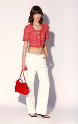 For a cool crop in a chic bright tweed, try our Rita Top. With floral shape buttons and self fringe accents, wear it with your favorite jeans or back to the Rebel Skirt for a playful set