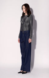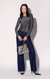 Get ready to go out with the Charlie Top. In our sparkly and sleek knit fabric, this front slit style looks great with everything from casual jeans to sassy leather skirts