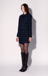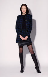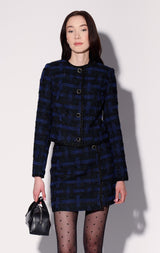 The Rhonda Shape is a classic collarless jacket in our beautiful tweed with ribbon accents and luxe enamel buttons. Cool with jeans, it makes a chic statement worn back to the matching Rachel Skirt