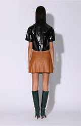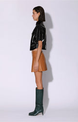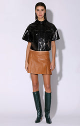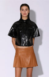 The Dylan Top is both oversized and cropped and sure to give instant cool to any look. With short sleeves and covered snaps, it is a fresh take on a leather top