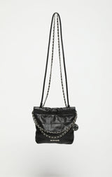 Front bottom logo in lacquered metal; Shoulder strap metal chain interlaced with leather, with solid crossbody tube strap; Open top with magnetic closure; Interior slip pocket and credit card slots with debossed logo; Fully lined; Comes with dust bag