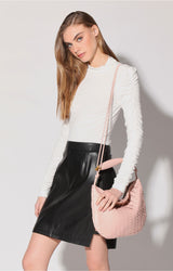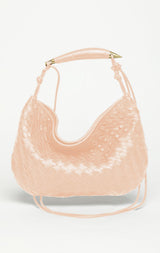 The Hazel Hobo is the must have shape of the season and is perfect to go from day to night. Made in supple leather, with our signature puff weave, it showcases a sculptural leather wrapped metal handle